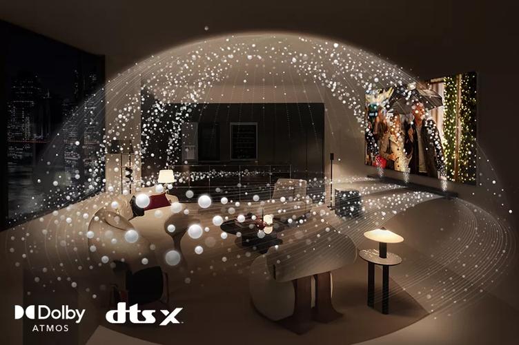 Get ready for an unforgettable cinematic sound experience. This 5.1.3-channel soundbar has an impressive combination of an up-firing center speaker, a powerful subwoofer and wireless rear speakers. Dolby Atmos®¹ and DTS:X®² technologies create a spatial audio dome that fills even the largest rooms.
