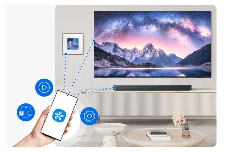 Quickly access soundbar features through your phone. Simply connect your soundbar to the SmartThings app via Wi-Fi and stream music, adjust the volume, enable group play or access voice assistants with ease.