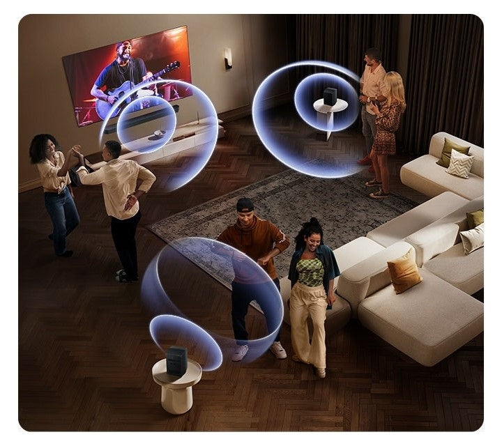 Sync the rear speakers with the soundbar instead of using them for surround sound so you can pump up the volume and get the party started.